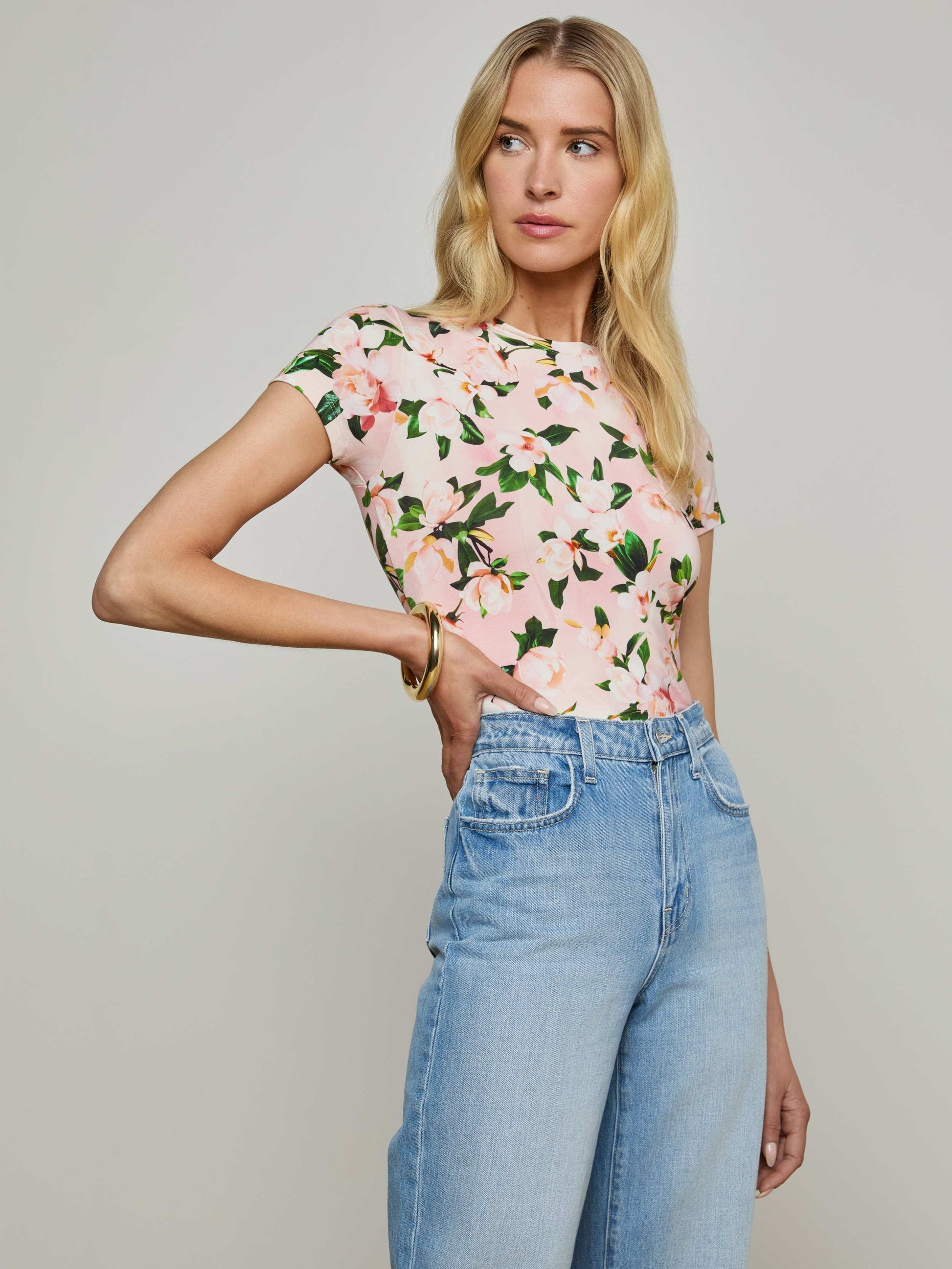In a soft, supple fabrication and slim cut, Ressi is our most flattering short sleeve tee. This L'AGENCE favorite is back in a floral magnolia print.