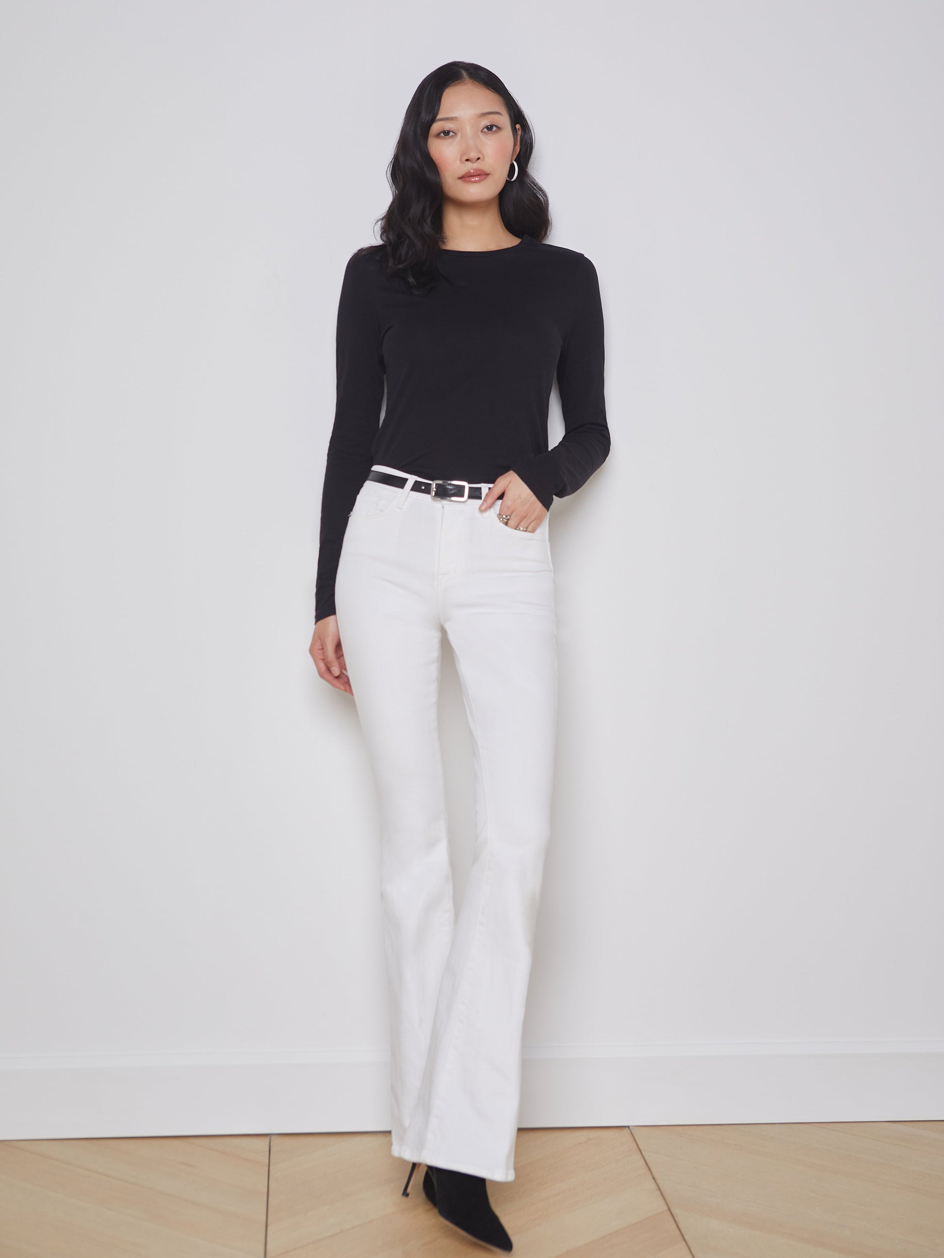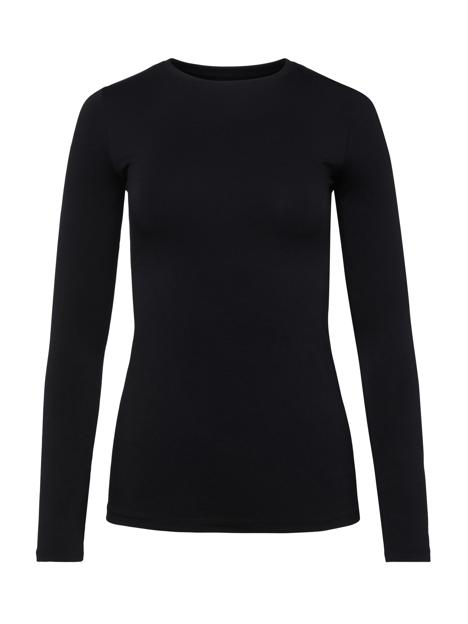 A form-fitting, long-sleeved crew neck tee in rich black. Crafted from soft and stretchy luxe microfiber, Tess features a high crew neck, long sleeves, and a smooth, lean fit.